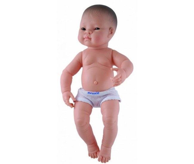 Papusa este imbracata cu lenjerie de corp si vine ambalata intr-o punga de plastic. Are caracteristici bine definite, pentru a arata cat mai natural si pentru a permite identificarea rasei din care face parte. Are corpul parfumat. Papusa este articulata si are organe genitale definite. Papusa este din vinil si poate fi spalata. Dimensiuni: inaltime 40 cm.
