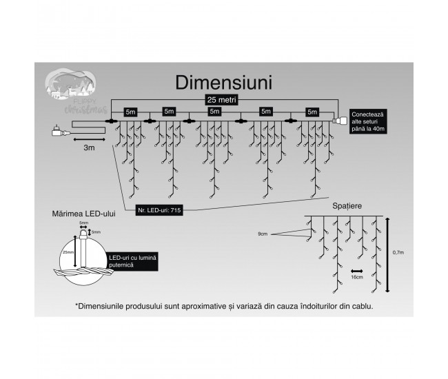 Suprafata luminoasa are un total de 5 m metri. Lungimea prelungitorului este de 3 m. Ofera posibilitatea de a suspenda ghirlanda astfel incat sa poata fi ascuns cablul de alimentare atunci cand este conectat la priza.