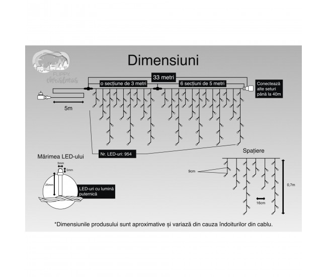 Suprafata luminoasa are un total de 33 m metri. Lungimea prelungitorului este de 5 m metri. Ofera posibilitatea de a suspenda ghirlanda astfel incat sa poata fi ascuns cablul de alimentare atunci cand este conectat la priza.