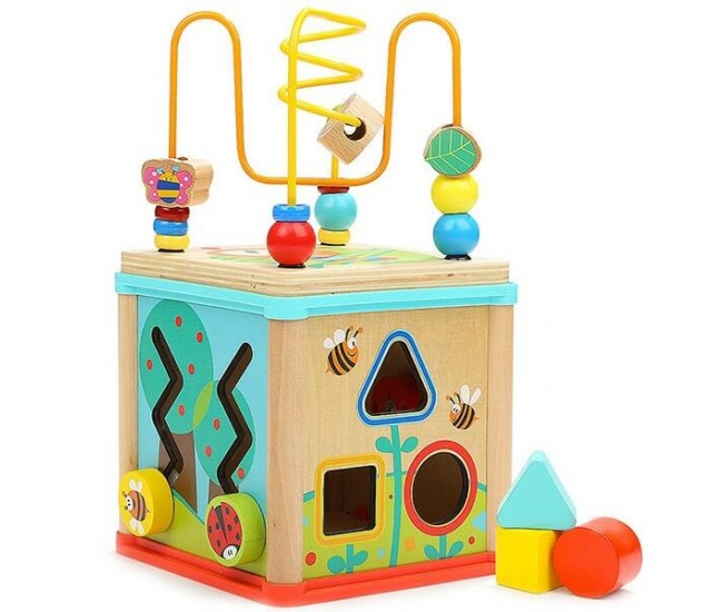 cubul educativ din lemn cu cinci activitati include: sortator cu diferite forme geometrice colorate, un ceas vesel colorat, un labirint cu piese culisante (albinuta si buburuza), un capac cu labirint cu bile colorate si angrenaj cu roti dintate