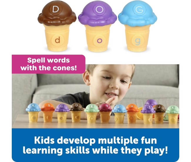 Copiii potrivesc literele mari cu literele mici in timp ce exploreaza fiecare portie de inghetata – o metoda excelenta de a recunoaste vizual literele si de a le asocia