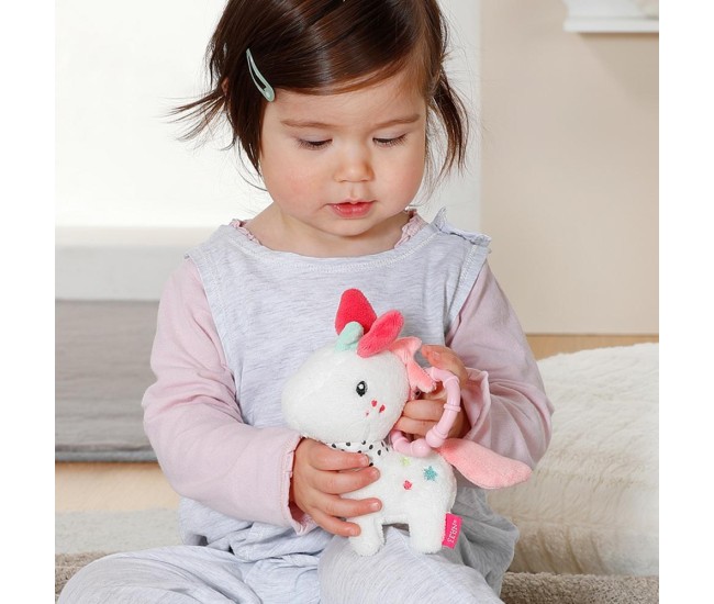 jucaria este prevazuta cu inel de prindere, astfel se poate atasa cu usurinta la patut, carucior sau la masina si il poate insoti pretutindeni
