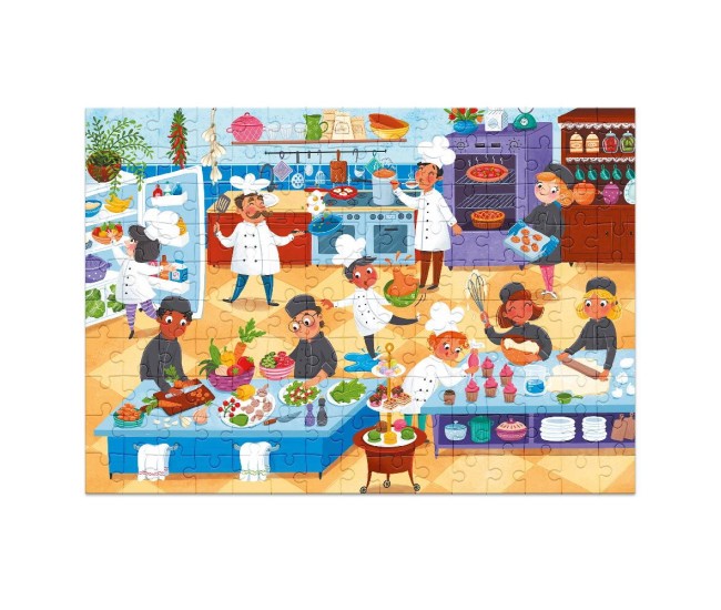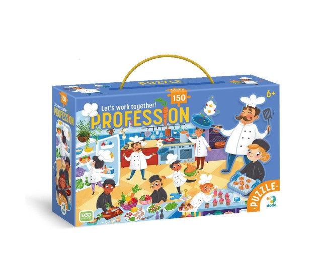 Puzzle-ul meserii - Bucatar de la Dodo, format din 150 de piese, ii invita pe copii sa exploreze fascinanta lume a bucatariei. Imaginea viu colorata infatiseaza o echipa de bucatari veseli, fiecare ocupat cu pregatirea unor delicii culinare. De la supe aromate si prajituri proaspat scoase din cuptor, pana la servirea preparatelor, acest puzzle reda atmosfera plina de viata dintr-o bucatarie adevarata.